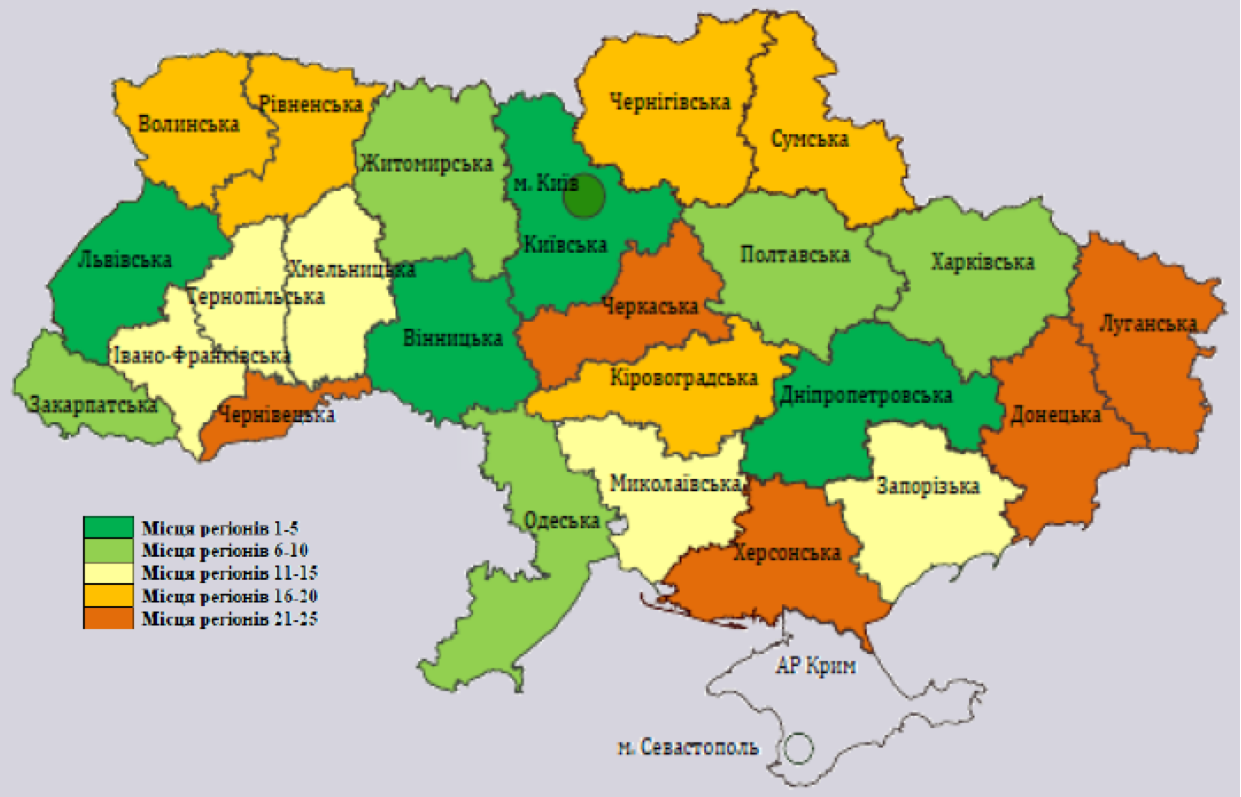 - найкращі місця займають м. Київ (1), Київська (2), Вінницька (3), Дніпропетровська (4), Львівська (5) області;